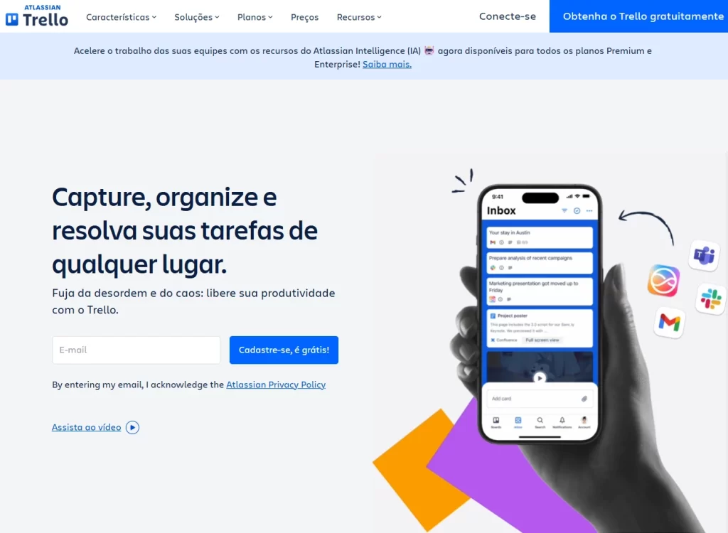 O Trello é uma ferramenta de gestão de projetos super visual e amigável, que usa um sistema de quadros, listas e cartões para te ajudar a organizar qualquer coisa, desde tarefas pessoais até grandes projetos de equipe.